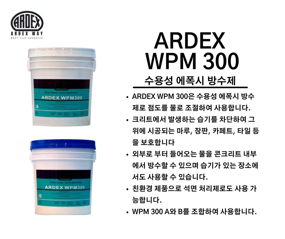 ARDEX WPM 300은 수용성 에폭시 방수제로 점도를 물로 조절하여 사용합니다.