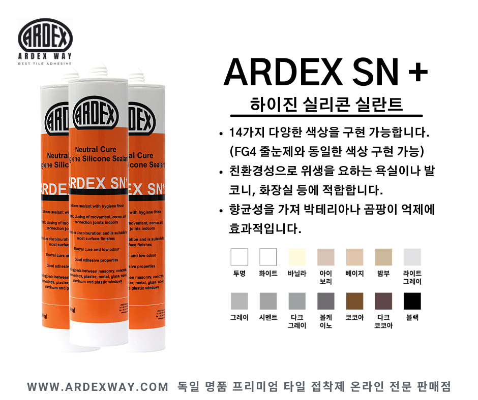 ARDEX SN+는 고성능 실리콘 실란트로 탄성과 복원력이 뛰어나고 경화시간이 빠른 특징일 지니고 있습니다.