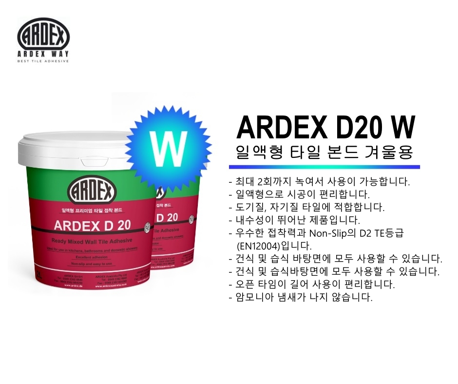 - ARDEX D20은 위험물질은 아니지만 피부에 직접적인 접촉을 피하고 접촉되었을 경우 굳기 전에 비누와 물로 깨끗이 씻어내어야 합니다.