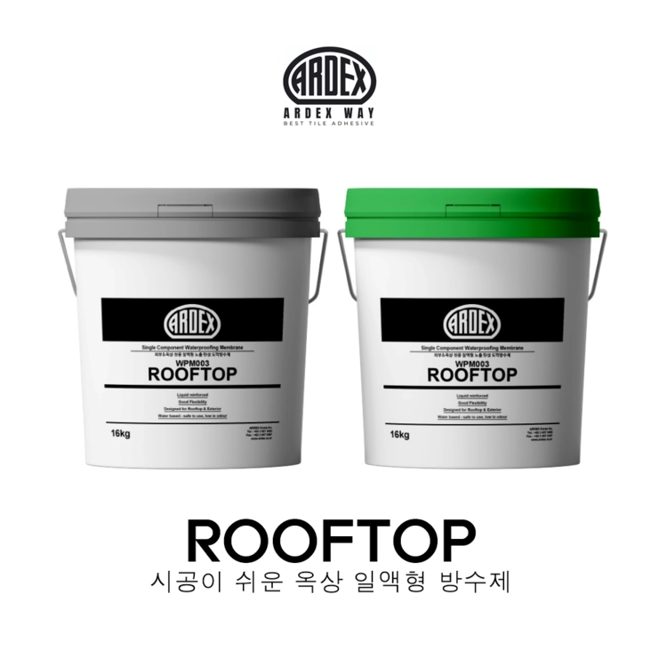 ARDEX WPM003 ROOFTOP 은 특수 탄성 아크릴 폴리머 기술을 기초로 만들어진 노출형 탄성 도막 방수제로서 신축건물이나 오래된 건축물의 옥상, 지붕 방수에 적합한 일액형 수성타입의 방수제입니다.